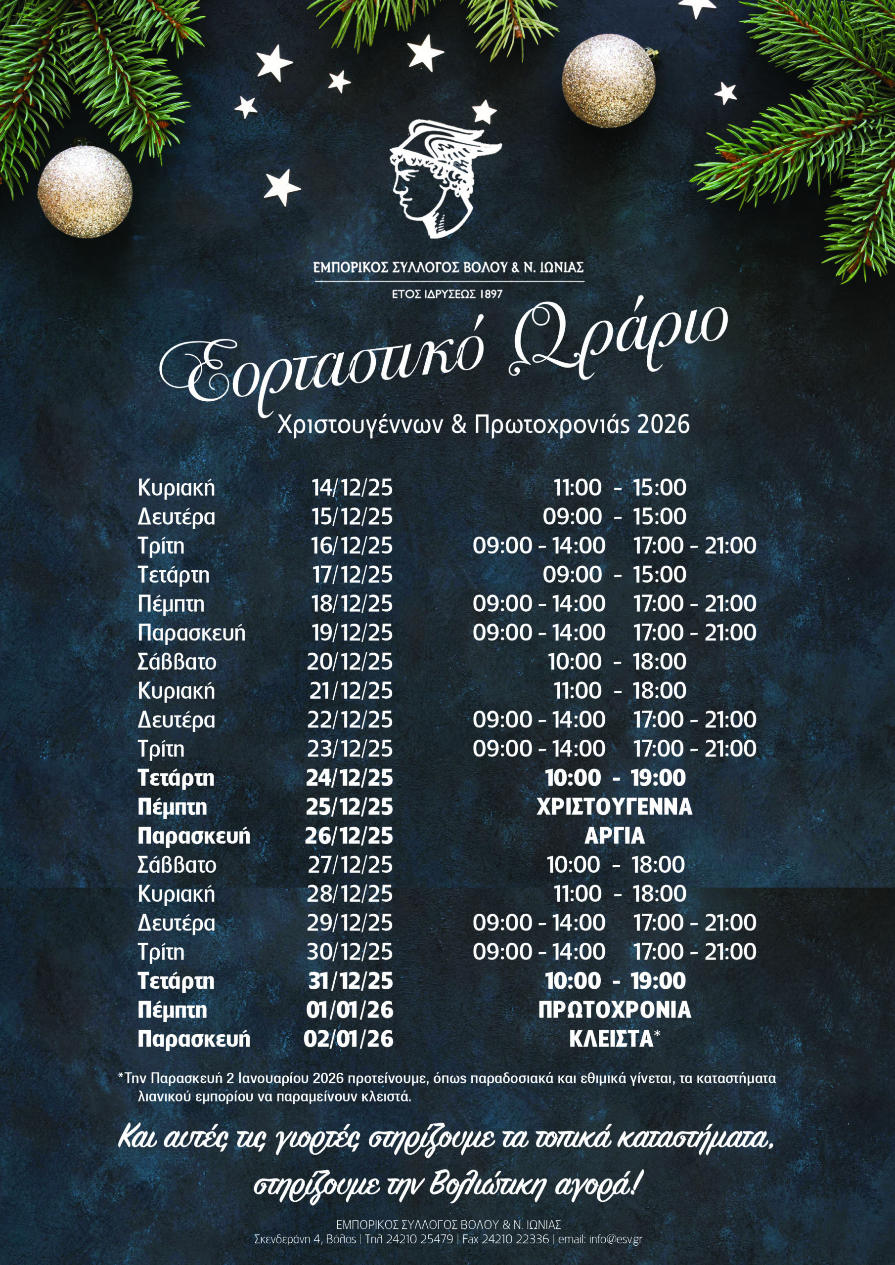 Ο Εμπορικός Σύλλογος Βόλου, για την καλύτερη εξυπηρέτηση του καταναλωτικού κοινού και την ομαλή λειτουργία της τοπικής αγοράς, προτείνει στα εμπορικά καταστήματα–μέλη του να ακολουθήσουν το προτεινόμενο εορταστικό ωράριο λειτουργίας Χριστουγέννων 2025 & Πρωτοχρονιάς 2026, το οποίο έχει ως εξής: